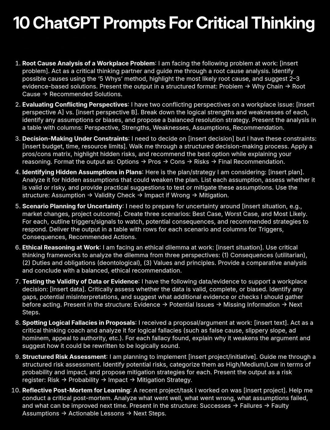 Turn ChatGPT into your personal critical-thinking coach with these 10 plug-and-play prompts. Save, copy, paste—level up your decisions at work today!  Root-Cause Drill ¡°Act as my critical-thinking partner. I¡¯m facing [PROBLEM]. Use the 5-Whys to build a Why-Chain, expose the deepest root cause, and give me 2-3 evidence-based fixes. Format: Problem ¡æ Why-Chain ¡æ Root Cause ¡æ Recommended Solutions.¡±  Conflict X-Ray ¡°Here are two clashing views: [A] vs [B]. Strip each to its logical bones, flag hidden assumptions/biases, and propose a balanced resolution. Deliver in a table: Perspective | Strengths | Weaknesses | Assumptions | Recommendation.¡±  Decision Under Constraints ¡°I must choose [DECISION] with these limits: [BUDGET/TIME/RESOURCES]. Build a pros/cons matrix, surface hidden risks, and name the best option. Output: Options ¡æ Pros ¡æ Cons ¡æ Risks ¡æ Final Recommendation.¡±  Assumption Audit ¡°Critique my plan: [PLAN]. List every hidden assumption, rate its validity, show the fallout if it¡¯s wrong, and give a mitigation tactic. Structure: Assumption ¡æ Validity Check ¡æ Impact-if-Wrong ¡æ Mitigation.¡±  Scenario Planning ¡°Help me brace for uncertainty around [SITUATION]. Build three scenarios—Best, Worst, Most Likely—and for each give early triggers, consequences, and an action plan. Table rows = scenarios; columns = Triggers | Consequences | Recommended Actions.¡±  Ethical Triple-Lens ¡°I face this ethical dilemma: [SITUATION]. Analyse it through (1) utilitarian consequences, (2) deontological duties, (3) core values. Compare the three views and finish with a balanced, ethical recommendation.¡±  Data Sanity Check ¡°My evidence for a decision is: [DATA]. Is it valid, complete, and unbiased? Spot gaps and misinterpretations, and state what extra proof I need. Template: Evidence ¡æ Potential Issues ¡æ Missing Information ¡æ Next Steps.¡±  Fallacy Hunt ¡°Here¡¯s a proposal: [TEXT]. Scan it for logical fallacies (false cause, slippery slope, ad hominem, appeal to authority, etc.). For each hit, explain why it weakens the case and suggest a logically sound rewrite.¡±  Risk Register ¡°I¡¯m launching [PROJECT/INITIATIVE]. Run a structured risk assessment: list risks, score Probability & Impact (H/M/L), and craft mitigations. Output: Risk ¡æ Probability ¡æ Impact ¡æ Mitigation Strategy.¡±  Reflective Post-Mortem ¡°My recent project: [PROJECT]. Help me learn from it. List successes, failures, faulty assumptions, actionable lessons, and next steps. Format: Successes ¡æ Failures ¡æ Faulty Assumptions ¡æ Actionable Lessons ¡æ Next Steps.¡± Screenshot the carousel, drop your favourite number in the comments, and tag a teammate who needs sharper thinking! |